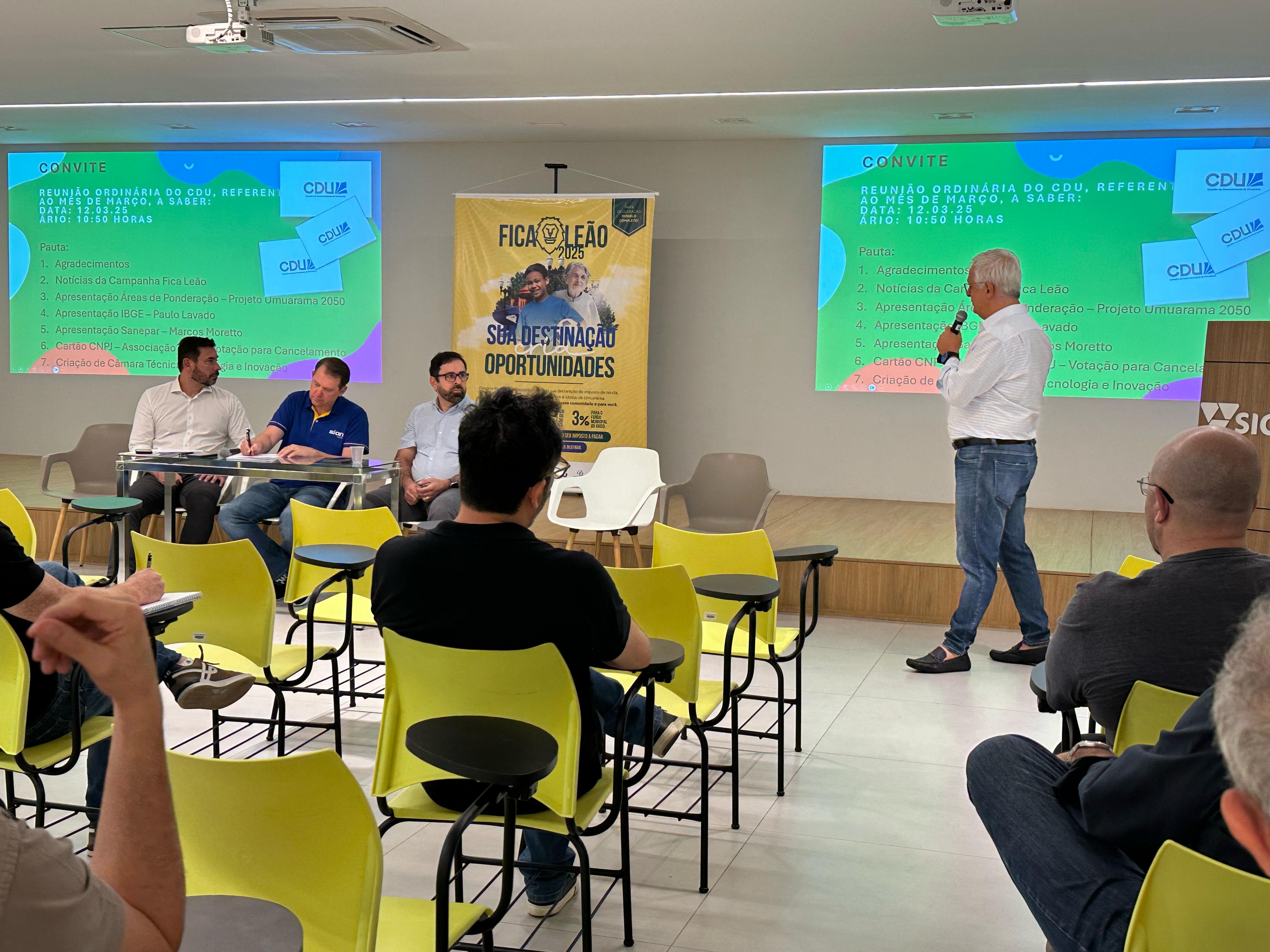 No dia 12 de março de 2025, o Conselho de Desenvolvimento de Umuarama (CDU) se reuniu em sua sessão ordinária mensal no Sicoob - Administrativo, com a presença de autoridades e representantes das mais diversas entidades da cidade. Sob a coordenação do Presidente Valcir Simão e com o apoio do Secretário-Executivo, Sérgio Vercezi Filho, a reunião abordou uma série de questões importantes para o desenvolvimento local, incluindo a continuidade da Campanha “Fica Leão 2025” e o lançamento de novas iniciativas, como a criação de uma Câmara Técnica focada em Tecnologia e Inovação.