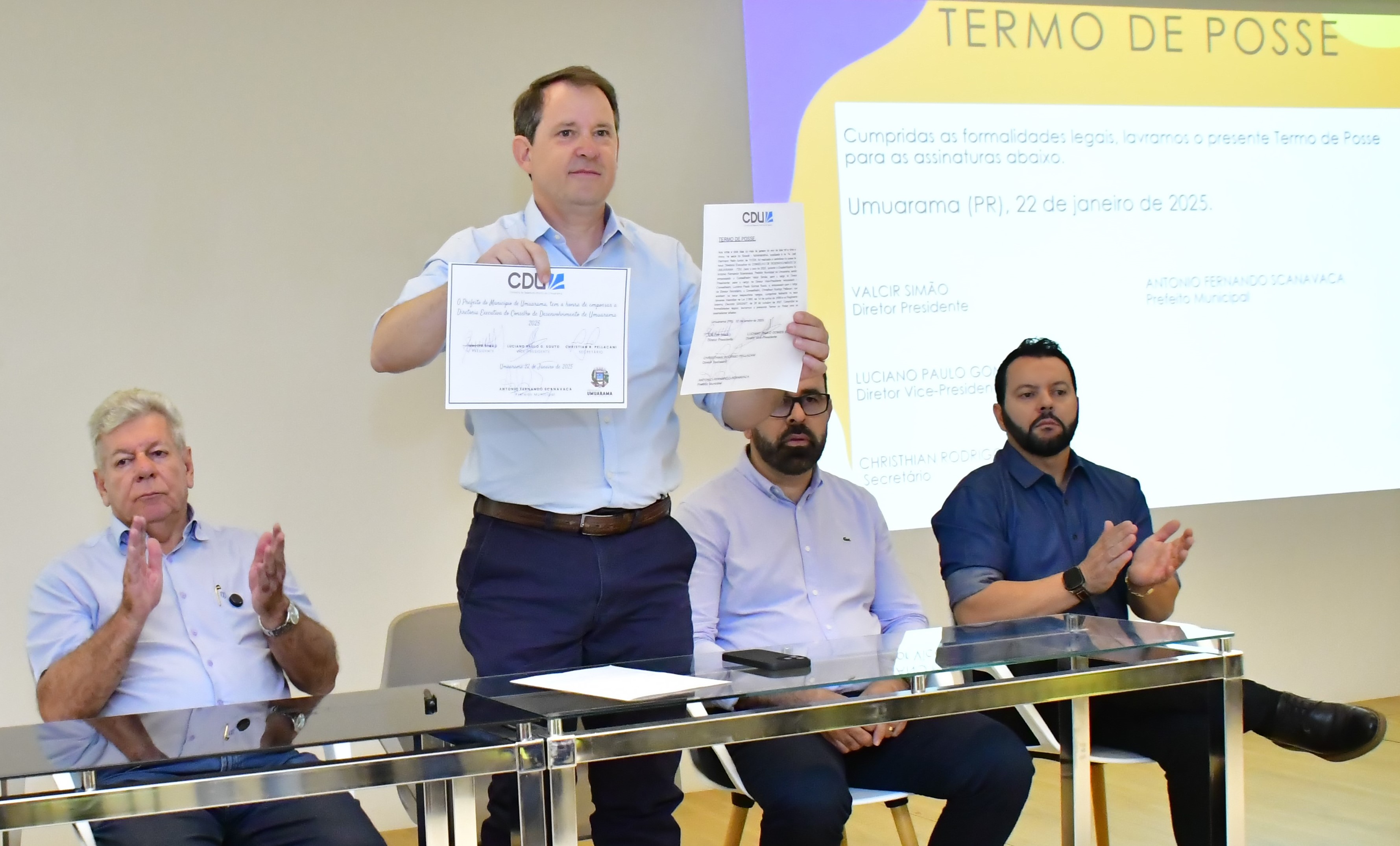 O prefeito de Umuarama, Fernando Scanavaca, participou na quarta-feira, 22, da cerimônia de posse da nova diretoria do Conselho de Desenvolvimento de Umuarama (CDU). O evento foi realizado no auditório da agência Sicoob Arenito, na Zona VI, e marcou a recondução do empresário Valcir Simão à presidência da entidade. Ele terá ao seu lado Luciano Paulo Gomes Souto como vice-presidente e Christian Rodrigo Pelacani como diretor-secretário.