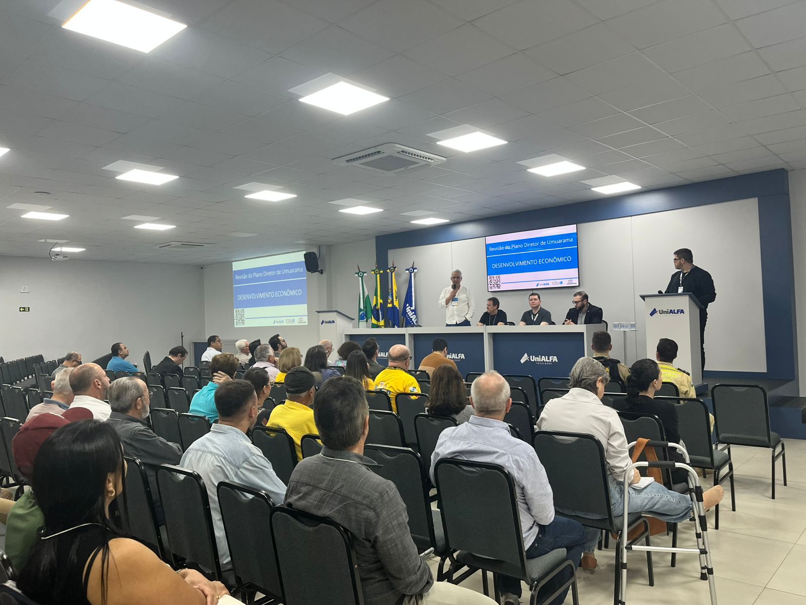 A Prefeitura de Umuarama, por meio da Secretaria Municipal de Aceleração Econômica, realizou a Primeira Audiência Pública para Revisão e Atualização do Plano Diretor Municipal (Lei Complementar nº 445/2018), conforme determina a Lei Federal nº 10.257/2001 (Estatuto da Cidade). O evento ocorreu de forma presencial no Auditório Prof. Luiz Carlos Rodrigues, nas dependências da Faculdade Unialfa, reunindo autoridades, representantes de instituições e a comunidade local.